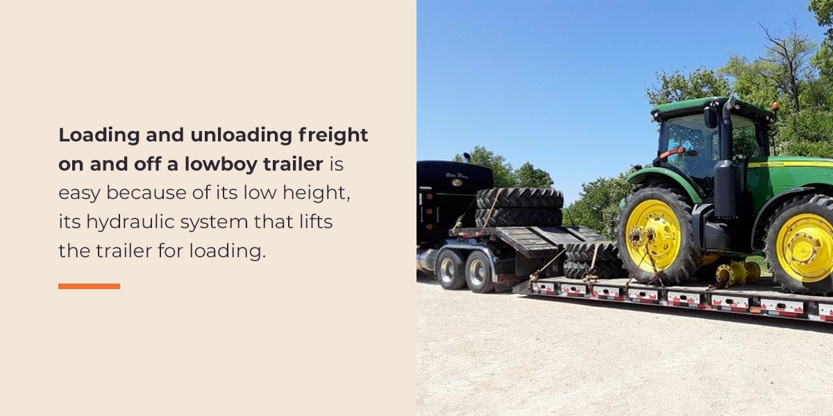Loading and unloading freight on and off a lowboy trailer is easy because of its low height, its hydraulic system that lifts the trailer for loading, and air brakes that ensure safe slowing down and stopping.